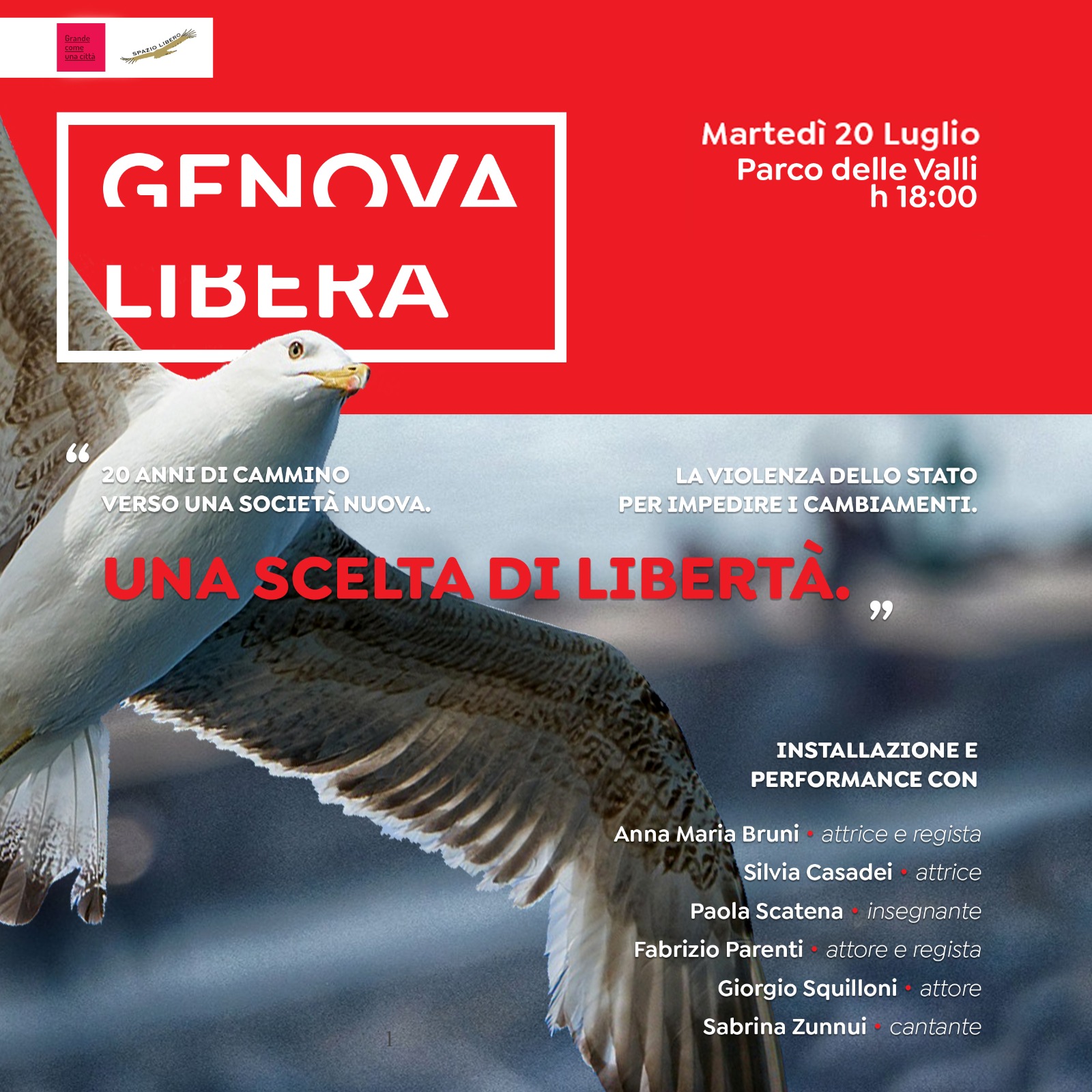 Tutto questo racconteremo con un’installazione, accompagnata da una performance di brani teatrali, letture, canti, veri e propri interventi, e aperta a chiunque voglia intervenire, per farne una nuova occasione di condivisione. “Genova libera”.